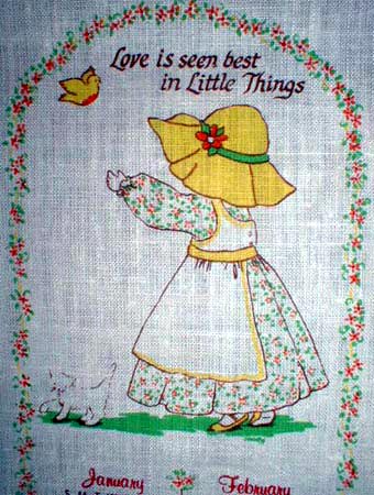 More old linen calendars from a Vermont country estate, all with the intricate detailing in their scenery that make them great gifts to commemorate the year of one's birthday, anniversary, or other special occasions. Take your pick of 3 vintage linen calendars all in excellent condition. 1 1989 calendar of a fishing village by the water with the old wooden boat at the dock, measuring approximately 26.5" x 16.25". 2 Cute 1988 calendar of a young boy and girl standing the the farmhouse field amid the chickens and roosters, measuring approximately 26.5" x 16.0". The wood crossbar to hang the calendar on the wall is broken and needs to be glued back together. 3 Sweet little 1980 calendar of a young girl in yellow bonnet with the inscription "Love is seen best in Little Things", measuring approximately 26.5" x 8.0".